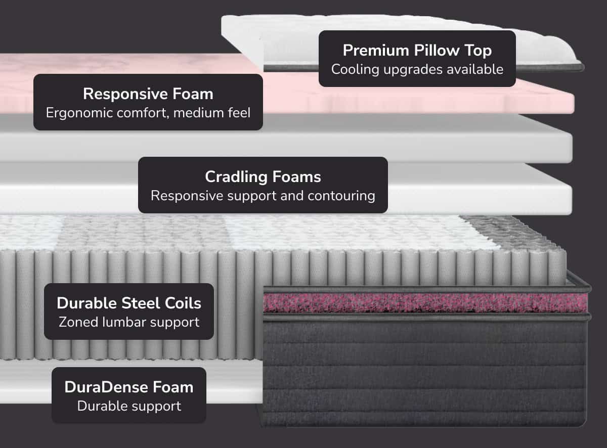 Our Luxe mattresses feature zoned lumbar support for enhanced contouring, a premium quilted pillow top with the choice of an ultra breathable TENCEL™ Cover or GlacioTex™ Cooling Cover, and are 2” taller than our Core Collection mattresses.