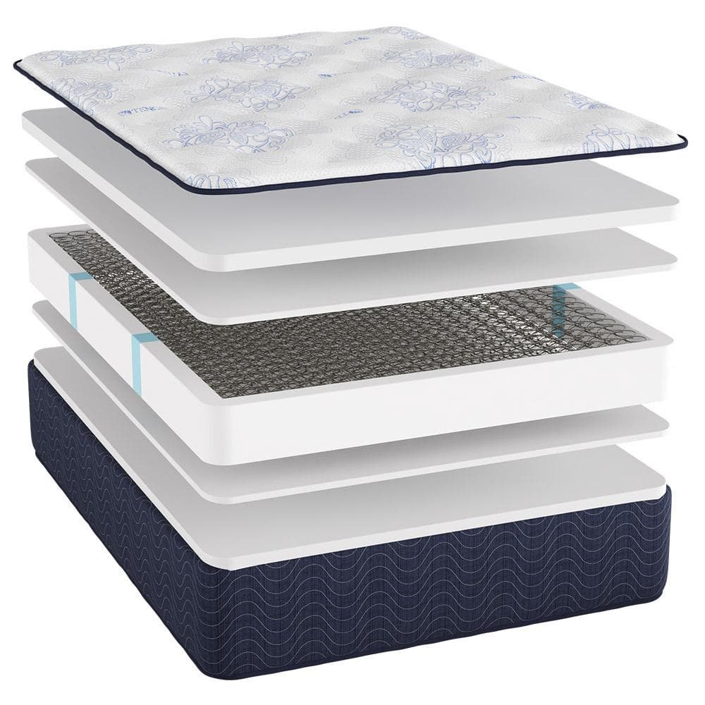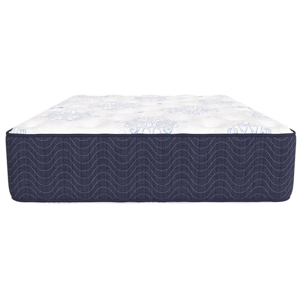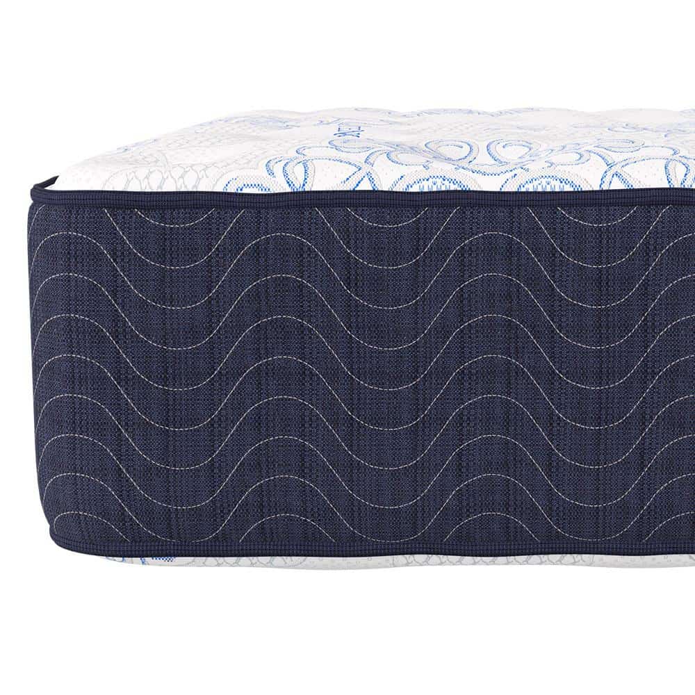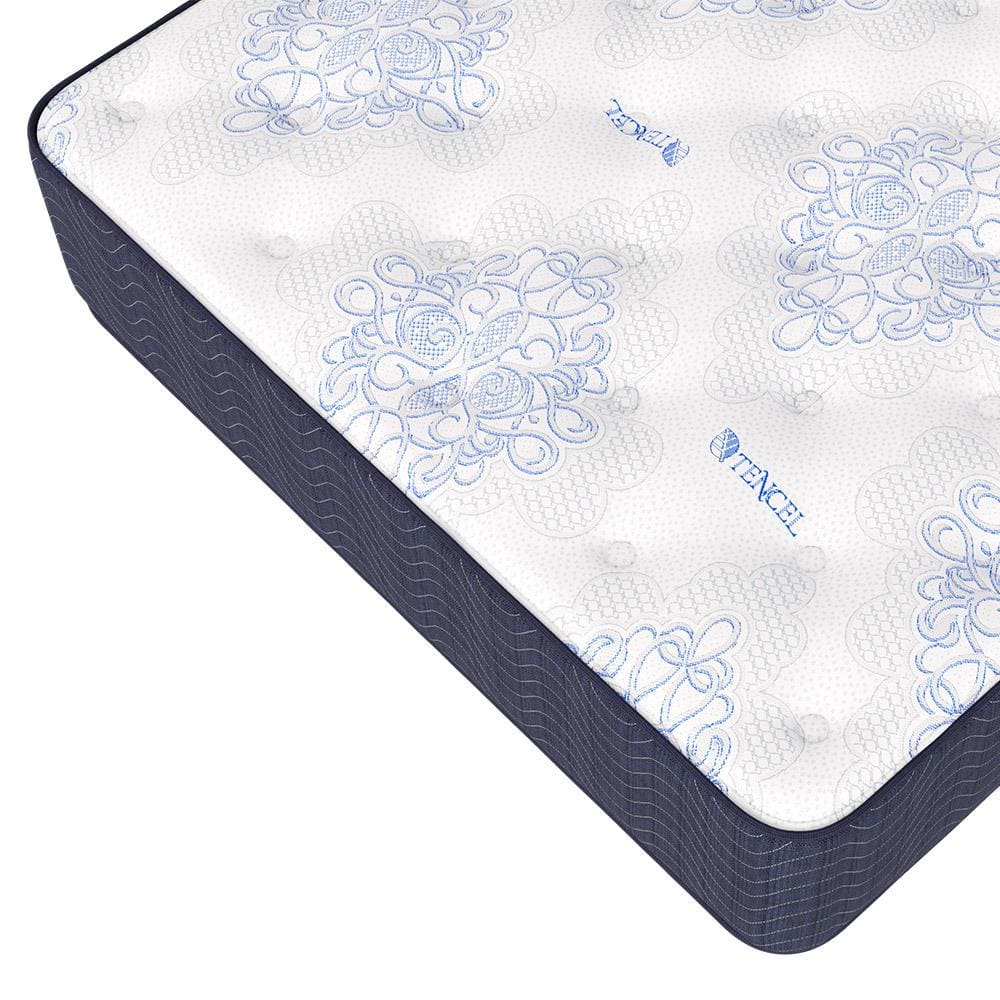 The Southgate Plush 2-Sided mattress features a white top with light blue floral patterns and dark blue sides with a wavy design. It feels firm and supportive, ideal for a bedroom setting where you can rotate and flip it for lasting comfort.